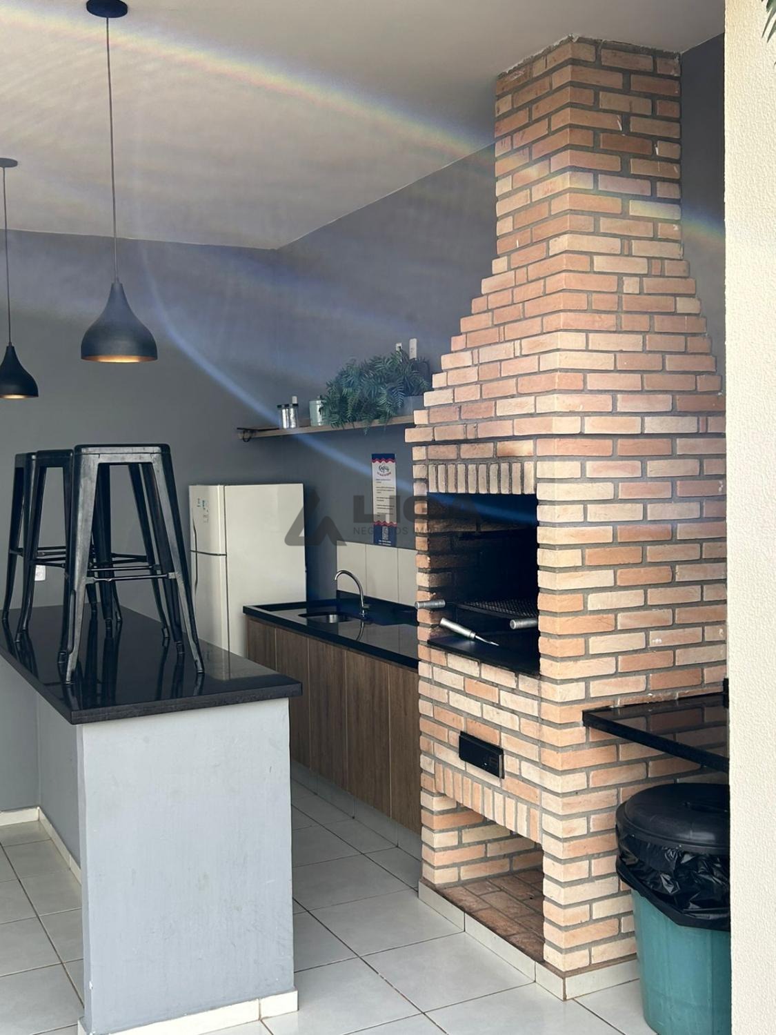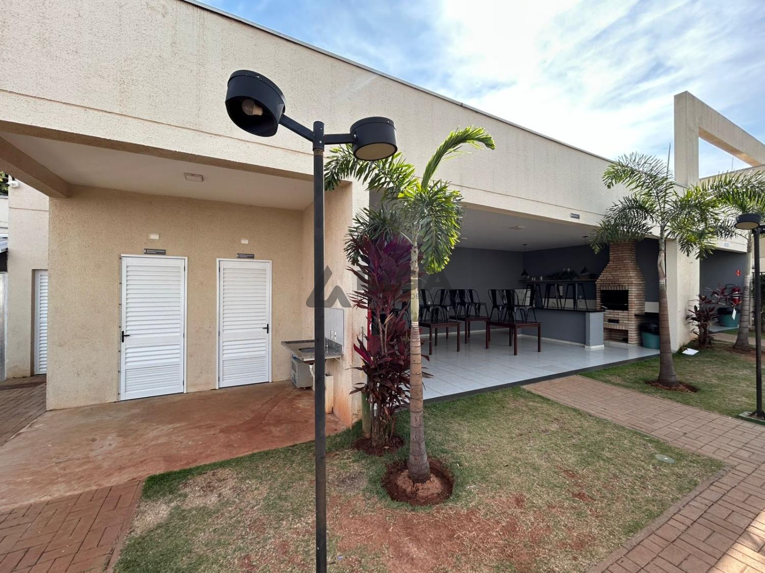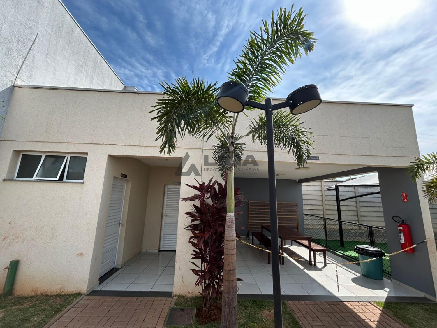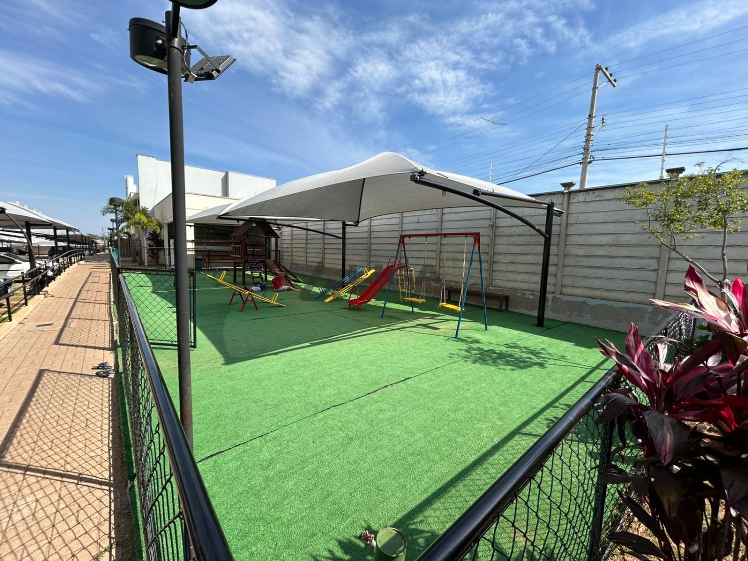 Parquinho com grama sintética, coberto e com iluminação